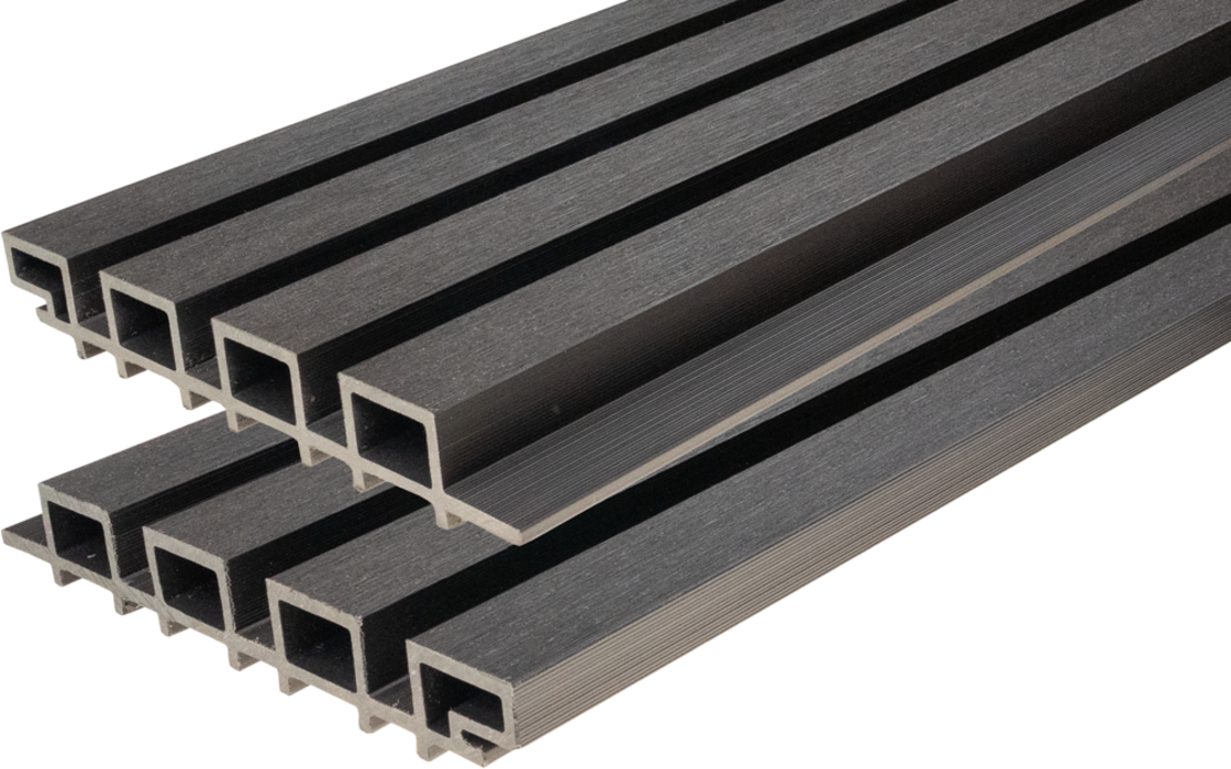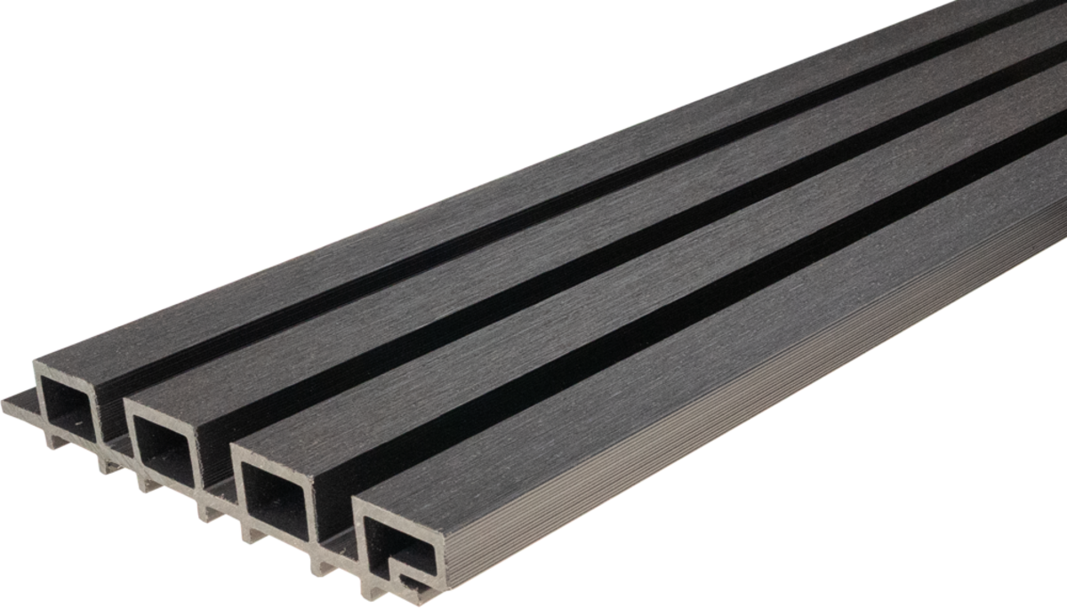 Gardin Deco 2.0 Wall Dark Silver to nowoczesna deska elewacyjna kompozytowa WPC, która łączy estetykę naturalnego drewna z trwałością i odpornością materiałów kompozytowych. Szeroka lamela o wymiarze 37 mm nadaje elewacji elegancki, minimalistyczny charakter i doskonale sprawdza się na większych powierzchniach, tworząc efekt prestiżowej fasady.